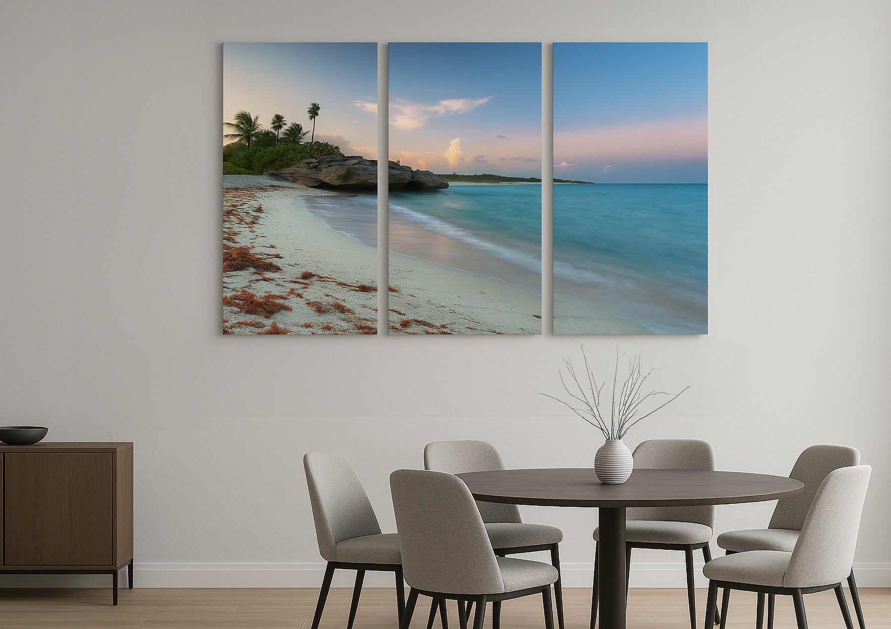 Escape to the coast with this vibrant 3-piece canvas wall art set featuring a serene tropical beach at sunset. From gentle waves and soft pastel skies to swaying palms and golden sand, the panoramic composition brings a calm, breezy atmosphere into any space. Each canvas is printed in high resolution, stretched on durable frames, and ready to hang. Perfect for living rooms, bedrooms, or beach house decor, this three piece adds a fresh and peaceful focal point to modern interiors.